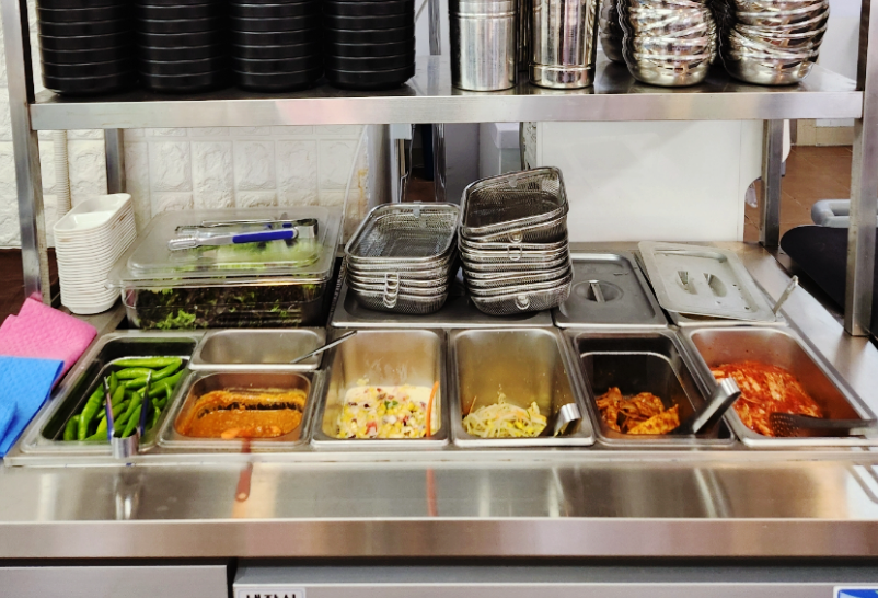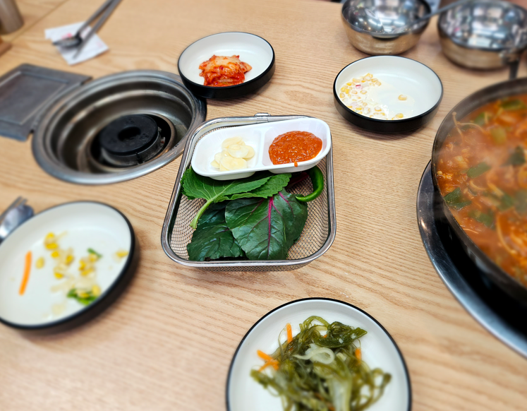 가정식 기본 반찬으로 김치, 콩나물무침, 어묵조림, 콘샐러드, 상추, 고추, 마늘 딱 필요한 것만 나왔습니다. 밑반찬은 셀프바를 통해 가져다 먹을 수 있어요. 매콤한 돼지찌개에 콩나물무침과 야채를 몇 번이나 가져왔어요.