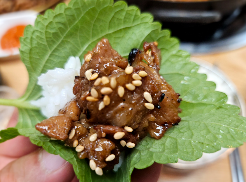 석쇠구이는 아주 강렬한 첫인상을 남겼습니다. 보기에도 먹음직스럽죠? 돼지고기의 기름기가 적당히 빠지면서 불맛이 입혀져 고소함이 더해졌습니다. 함께 제공되는 쌈채소와 먹으니 한층 더 풍미가 살아났습니다.