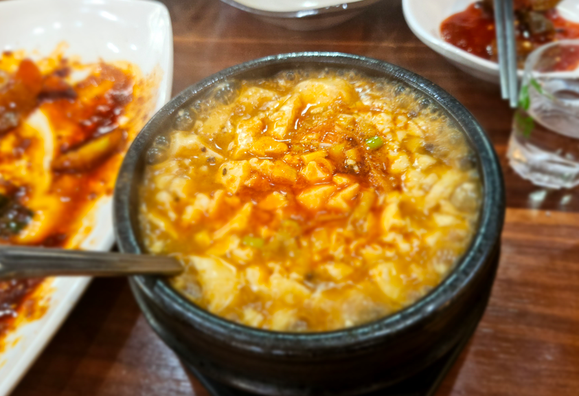순두부 찌개는 부드러운 순두부와 시원한 국물이 좋았습니다. 해물의 감칠맛이 더해져 깊은 풍미를 자랑했고, 매운맛과 부드러운 두부의 조화가 정말 좋았습니다. 누구나 부담 없이 즐길 수 있는 적당한 매운맛이 일품이었어요