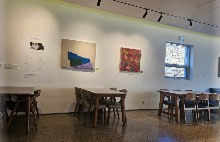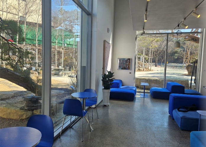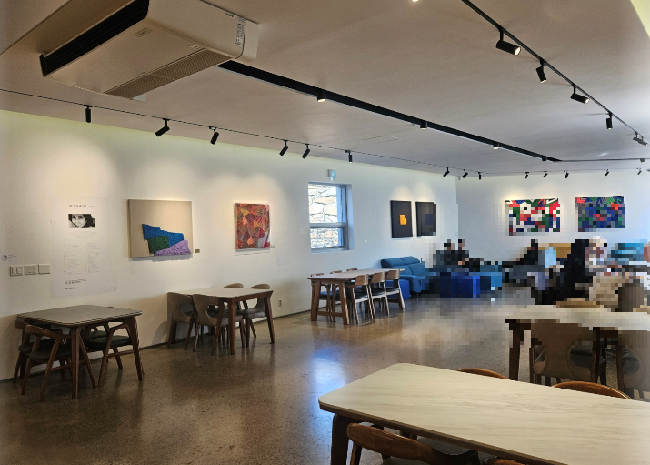 내부공간은 갤러리 존과 카페 존으로 나뉘며, 갤러리 존에서는 벽면에 전시된 작품을 감상할 수 있어요.