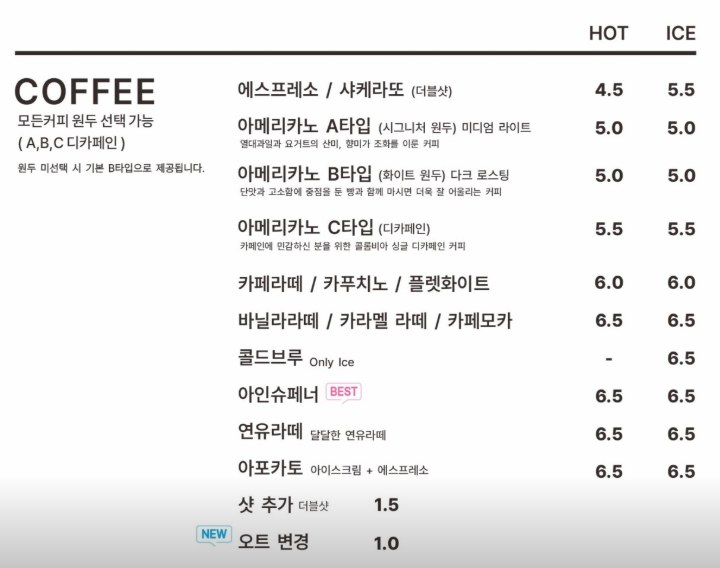 아메리카노는 3종류가 있는데요, 시그니처 원두로 열대과일과 요거트의 산미, 향미가 조화를 이룬 A타입과, 다크 로스팅으로 단맛과 고소함에 중점을 둔 빵과 함께 마시면 더욱 잘 어울리는 B타입, 마지막으로 디카페인의 C타입이 있어요