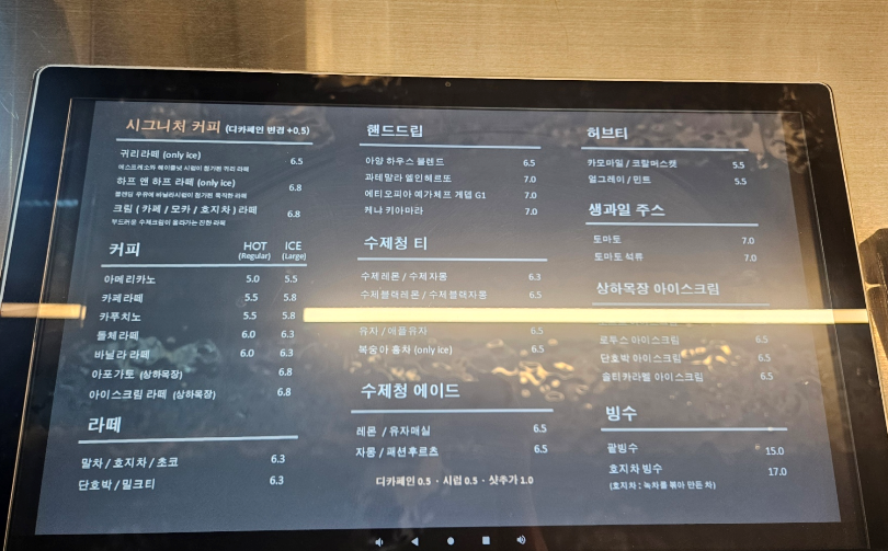 가격대는 일반 카페보다 조금 높은 편이지만 이 정도 규모와 분위기를 고려하면 합리적인 수준이었어요