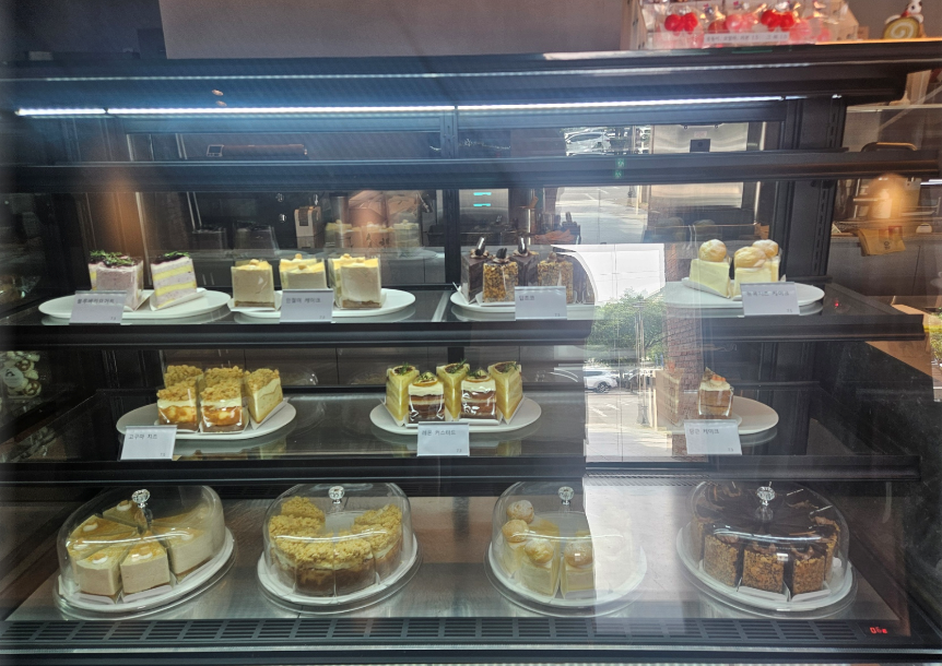 디저트로는 각종 조각 케이크, 롤케이크, 마들렌, 쿠기가 있어요 하지만 베이커리 종류는 많지 않아요