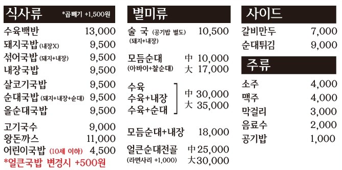 순대도 좋아한다면 돼지와 내장 그리고 순대가 들어간 순대국밥을 추천해요 그리고 혹시나 국밥을 먹지 못하는 일행이 있다면 왕돈까스도 있으니 함께 식사를 즐길 수 있습니다.