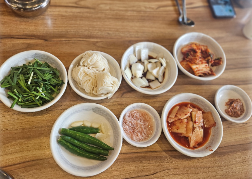 소면, 깍두기, 김치, 마늘 등 일반적으로 국밥집에 나오는 밑반찬 구성과 동일합니다. 부산 국밥집 가면 나오는 부추도 푸짐하게 나와서 좋아요. 저는 부추를 항상 리필애서 국밥 가득히 올려서 먹는 것을 좋아합니다.