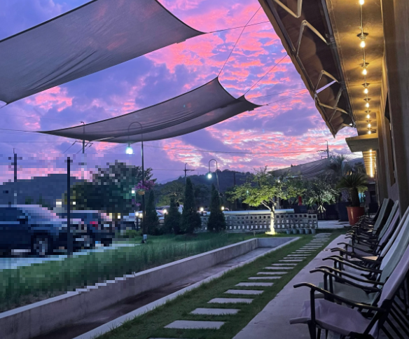 넓은 창으로 보이는 바깥 풍경은 푸르른 자연과 어우러져 평온함을 주고, 야외 테라스는 특히 좋은 날씨에 인기 있는 자리입니다.