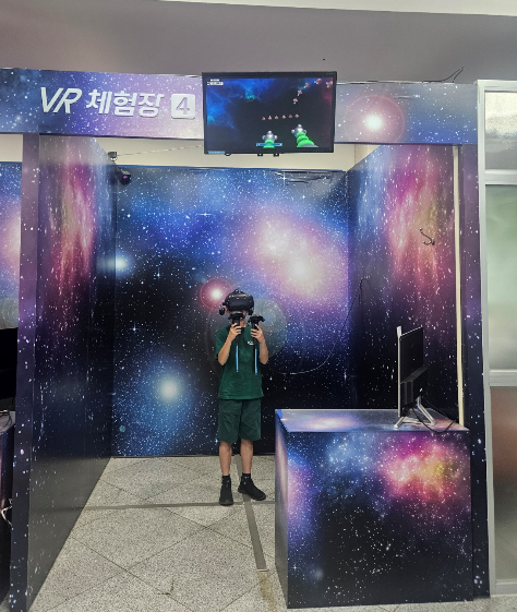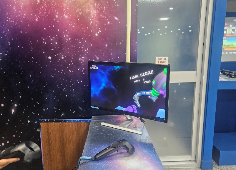 헤드셋을 쓰고 가상현실 속에서 다양한 타깃을 맞추는 게임인데, 갤러그의 3D 버전 같았어요