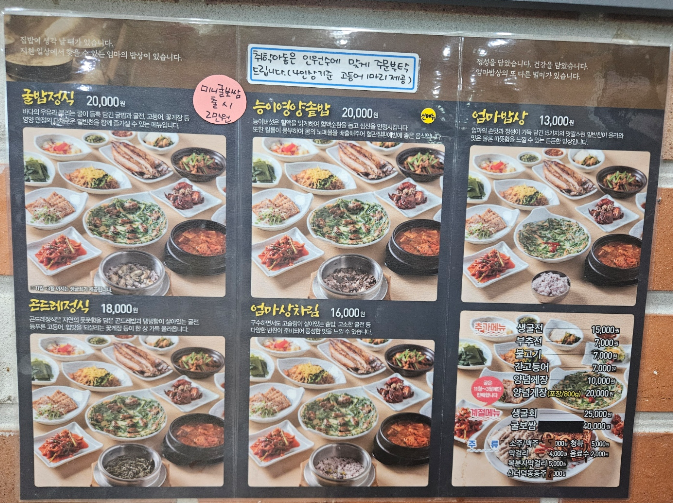 엄마밥상은 돌솥이 아니라서 엄마상차림으로 주문했어요. 예전에 비해서 가격이 살짝 올랐네요. 사이드 메뉴로 생굴전, 부추전 등이 있었는데 나오는 음식의 양을 보고 추가 주문을 하려고 했는데 실제 음식이 나오는 것을 보니 추가 주문은 따로 안 해도 양이 푸짐했어요