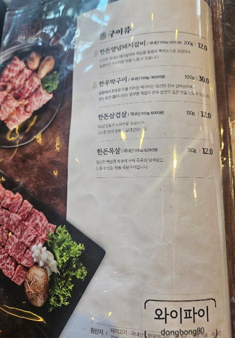 메뉴판을 살펴보니 다양한 고기 요리가 있었습니다. 특히 한돈 양념 돼지갈비가 유명하다고 하더라고요