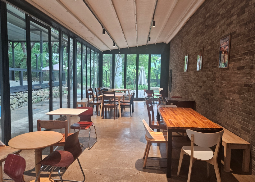 통유리창을 통해 들어오는 자연광과 나무 소재를 활용한 인테리어가 조화롭게 어우러져 따뜻하고 아늑한 분위기를 만들어냈어요