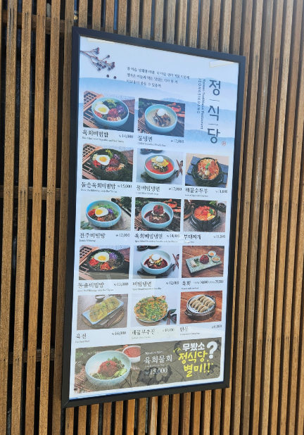정식당의 대표적인 메뉴는 육회비빔밥과 냉면이에요