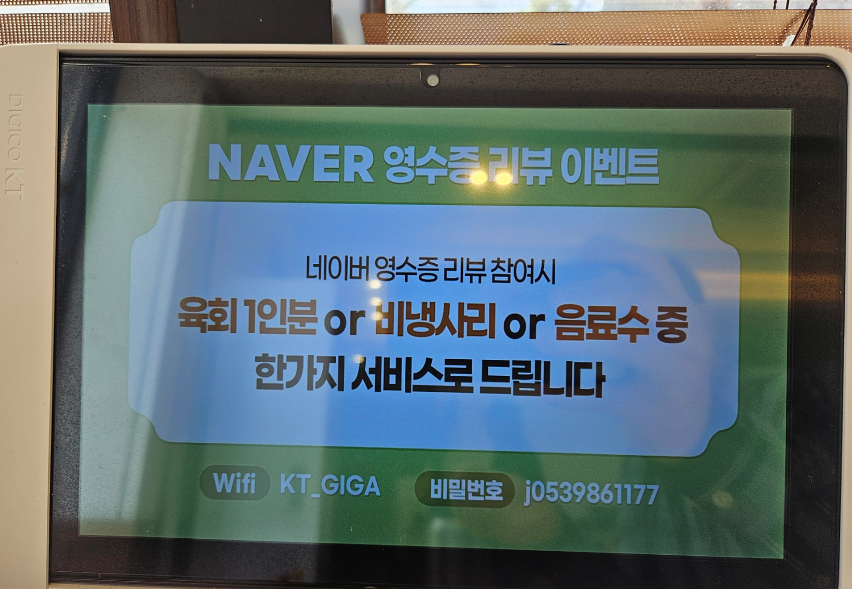 네이버 영수증 리뷰 이벤트도 진행중인데 육회1인분 or 비냉사리 or 음료수 중 한가지를 서비스로 받을 수 있어요