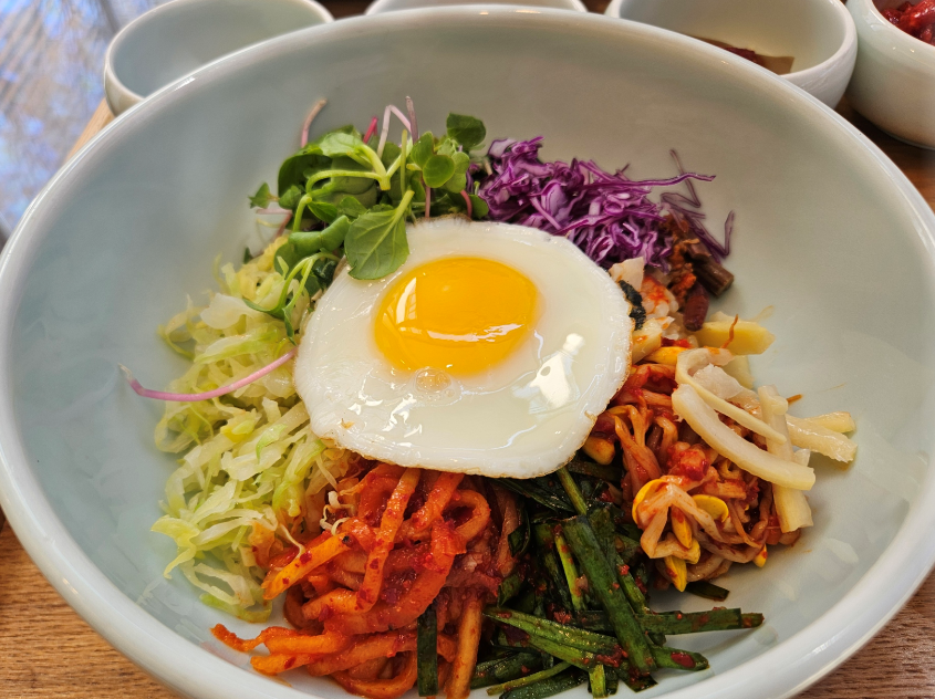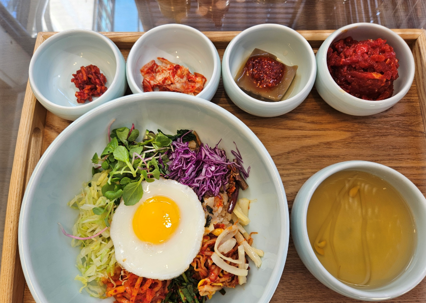 나물과 어린 새싹잎, 콩나물무침, 무생채, 계란프라이까지 다양한 재료가 들어가서 조화로웠어요