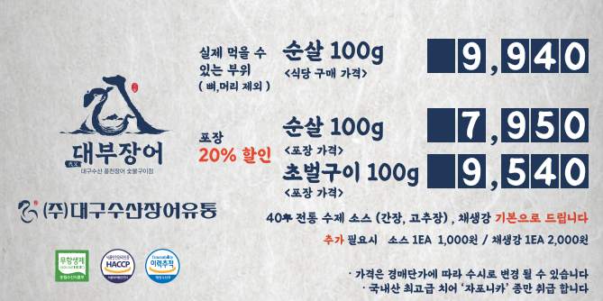 대부장어는 활어 기준가로 저렴하게 장어를 맛볼 수 있는 도매급 가격이 가장 큰 매력이에요