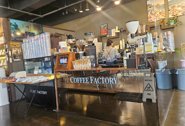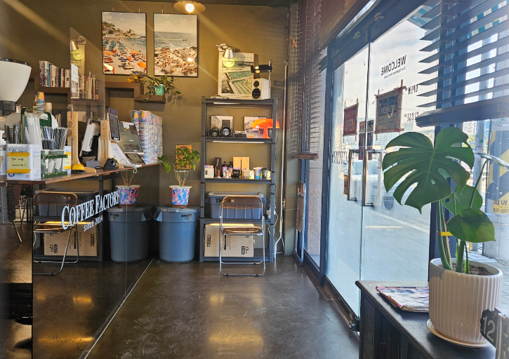 카운터에는 다양한 커피 기계와 원두가 진열되어 있어 커피 애호가들에게는 천국 같은 공간이에요. 목재 인터리어와 자연광이 들어오는 창문 덕분에 편안한 느낌이 들어요.