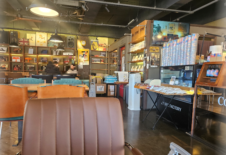 카페는 단층 구조로 규모는 작지만 내부는 넓은 테이블과 등받이가 있는 편안한 의자가 있어요. 방문 당시 오후 시간대였는데 테이크아웃 손님보다는 매장에서 커피를 즐기는 분들이 많았어요 창가 자리에서는 동화천의 풍경을 바라보며 여유를 누리기 좋았습니다.