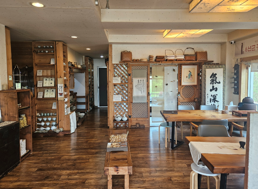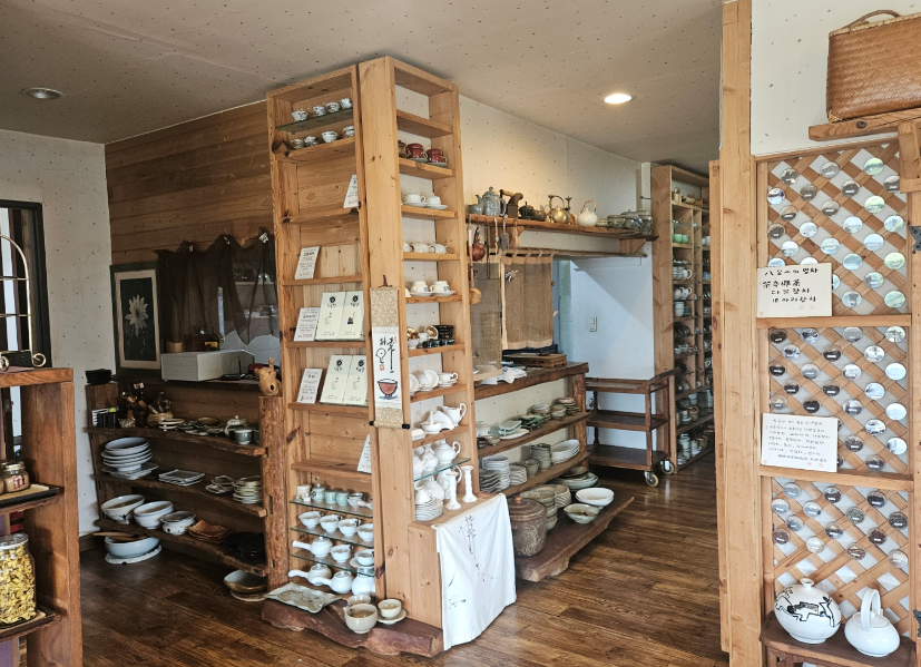 차실 곳곳에는 전통 다기와 다구, 도자기들이 조화롭게 배치되어 있어 전통적인 멋이 가득합니다.