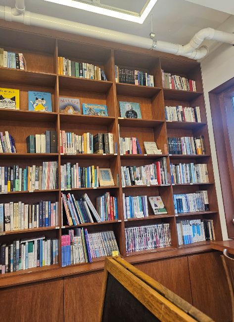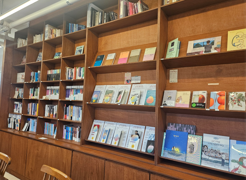 전체적으로 우드톤 인테리어와 아기자기한 소품, 그리고 곳곳에 사장님의 북 큐레이션이 느껴지는 책 진열이 인상적이었어요