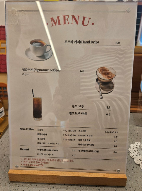 핸드드립 커피(조르바커피)는 6천 원으로 북카페답게 이름에도 의미가 담겨 있고 깔끔한 산미와 드립 특유의 향이 좋았어요