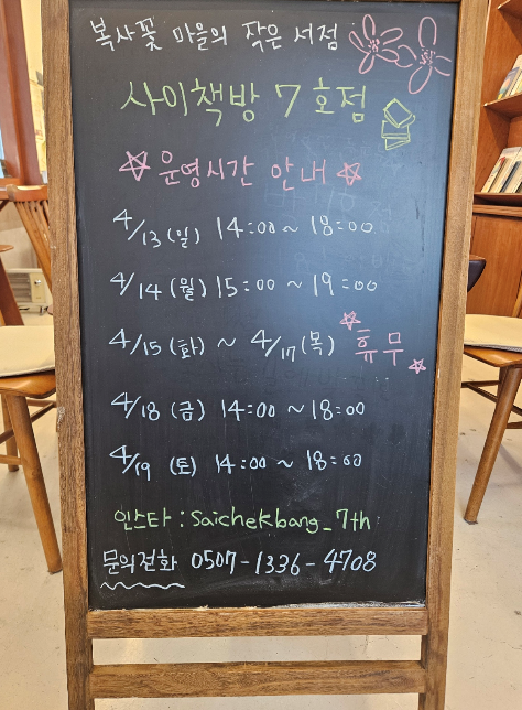 사이책방 7호점은 작은 단독주택을 개조한 듯한 아담한 건물로 푸른 잔디마당과 복사꽃 복숭아나무가 계절마다 아름답게 어우러집니다.