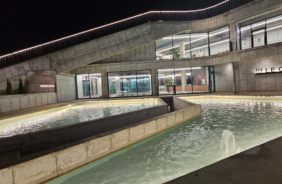 르씨엘은 고즈넉한 시내 외각에 위치하여 외관부터 감각적이고 현대적인 느낌을 줍니다. 건물의 규모와 크기에 엄청 압도 당했습니다. 특히 이 카페는 건축상도 받은 멋진 건물로 외부에 물을 활용한 독특한 인테리어가 인상적이었습니다. 낮에는 분수도 나온다고 하네요. 이 연못 같은 물이 카페 외관을 더욱 고급스럽고 특별하게 만들어 주었어요