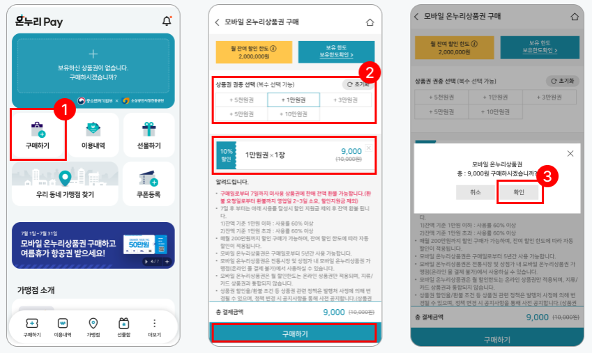 모바일 온누리상품권은 카드형 온누리상품권과 동일하게 할인율 10%에 200만 원까지 구매할 수 있습니다. 설을 맞아 이벤트 기간에는 15% 할인을 적용받을 수 있습니다.