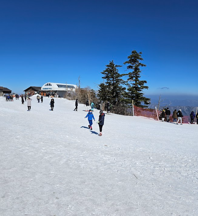 드넓은 눈밭을 볼 수 있어요. 스키 타는 사람도 많아요.