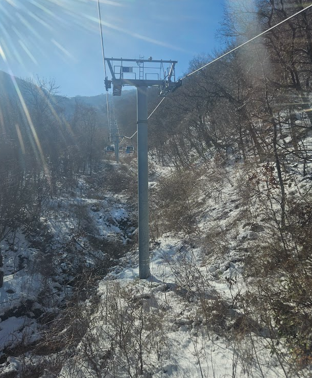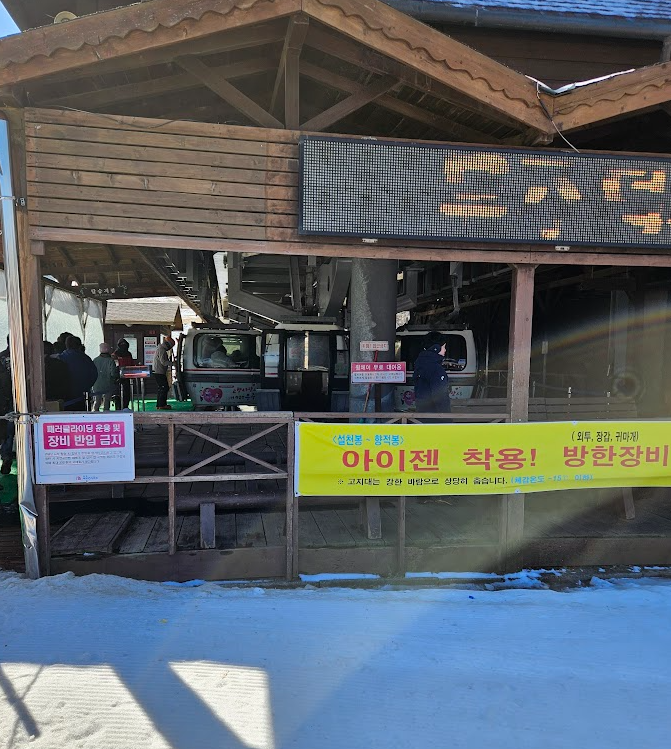 곤도라 타기 전 아이젠과 방한장비 착용이라는 현수막 보이시죠?