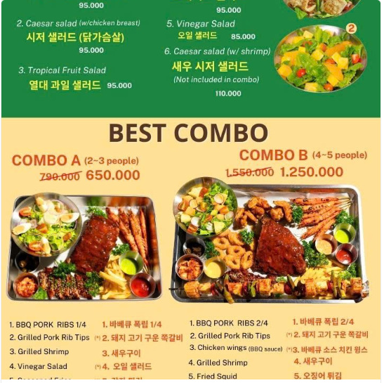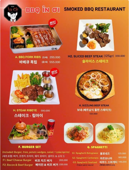 메뉴는 베트남 전통 음식부터 바비큐, 서양식 메뉴, 디저트, 음료까지 폭넓게 준비되어 있었어요.