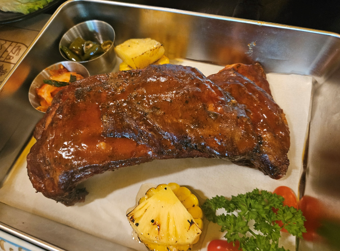 양도 푸짐하고 비주얼로 화려해요. 고기가 뼈에서 쉽게 분리될 정도로 부드럽게 익어 나오고 달콤하면서도 짭조름한 바비큐 소스가 입안 가득 퍼졌어요