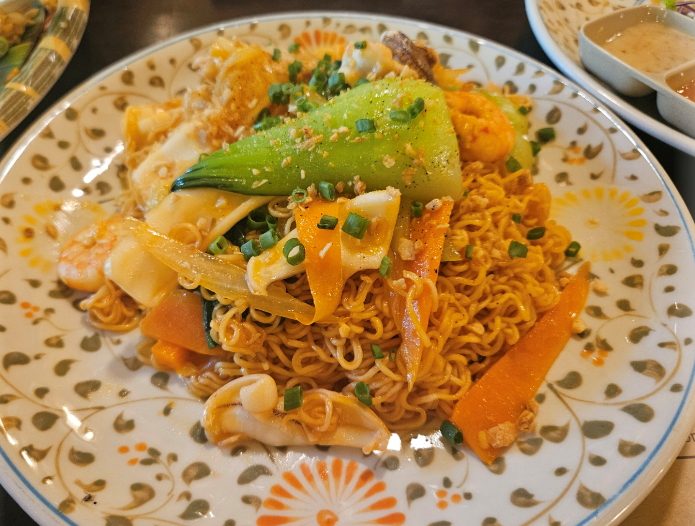 해산물 볶음면은 새우, 오징어, 조개 등 다양한 해산물이 풍부하게 들어가 있어 바다의 풍미를 느낄 수 있었어요.