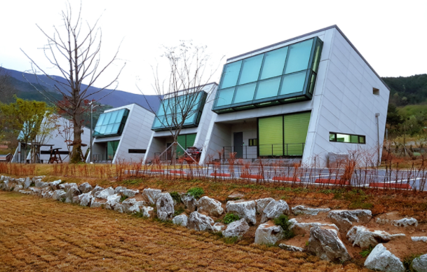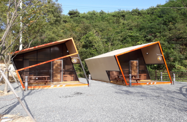 글램핑장은 사진에서 보는 것과 같이 특이한 구조로 되어있는데 2인용 침대, 침구류, 냉장고, 전자레인지, 전기밥솥 등 거의 모든 장비가 잘 구비되어 있어서 몸만 가면 하루 편하게 쉴 수 있겠더라고요. 관리동 안쪽으로 들어가면 4개의 펜션동이 나오는데 건물 모양이 다 특이했어요. 자세히 살펴보니 방안에서도 별을 볼 수 있게 약간 기울어진 모습으로 되어있어서 별을 관찰할 수 있어요.