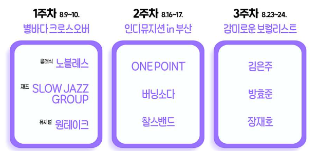 일주일마다 바뀌는 음악 컨셉으로 다대포를 수놓을 빛나는 부산의 아티스트들을 만나실 수 있습니다.