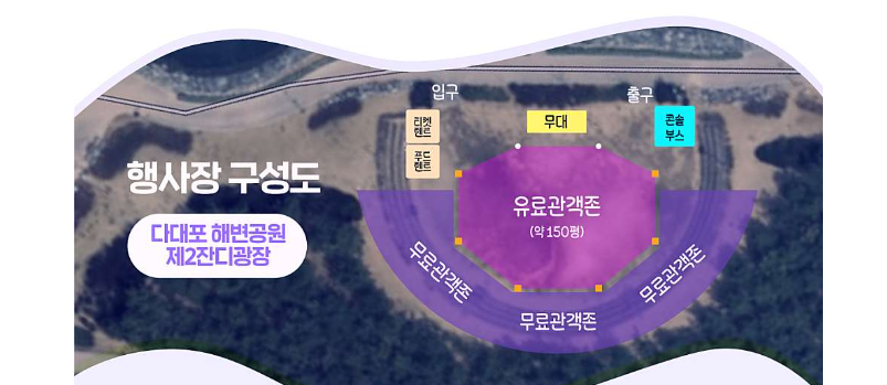 다대포 해변공원 제2잔디광장에서 진행되며 돗자리는 별도 제공되지 않기때문에 직접 챙겨가시는 걸 추천드립니다. 높이가 있는 의자와 큰 테이블은 반입이 금지되고, 외부 주류는 반입이 금지되나 먹을거리를 챙겨가는 건 허용이 됩니다. 한편 바로 옆 다대포 해변공원 제1잔디광장에서는 17시부터 21:30분까지 썸머 트래블쇼로 부산, 울산, 경남 관광기업지원센터 입주기업과 관광두레 주민사업체 중 선정업체의 매력적인 제품을 구매하고 다양한 체험을 즐길 수 있습니다.