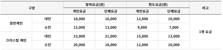 케이블카의 왕복 이용 요금은 일반 캐빈과 크리스탈 캐빈에 따라 차이가 있으며, 성인 기준으로 일반 캐빈은 약 18,000원, 크리스탈 캐빈은 약 23,000원 정도입니다. 어린이, 청소년, 경로우대 할인도 적용되므로 공식 홈페이지에서 상세 요금을 확인해 보시기 바랍니다.