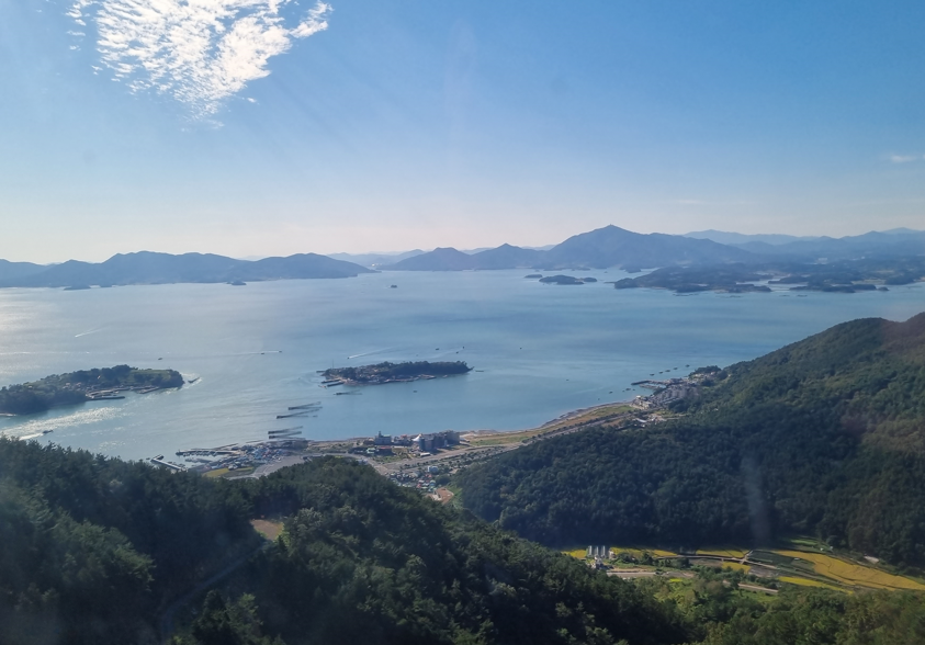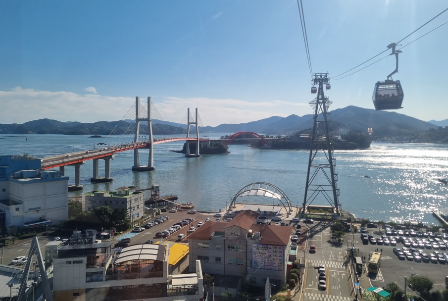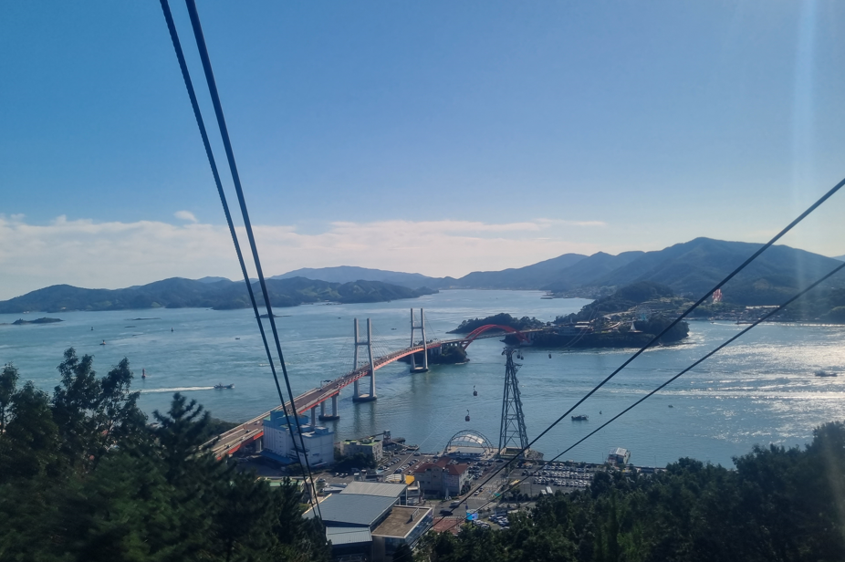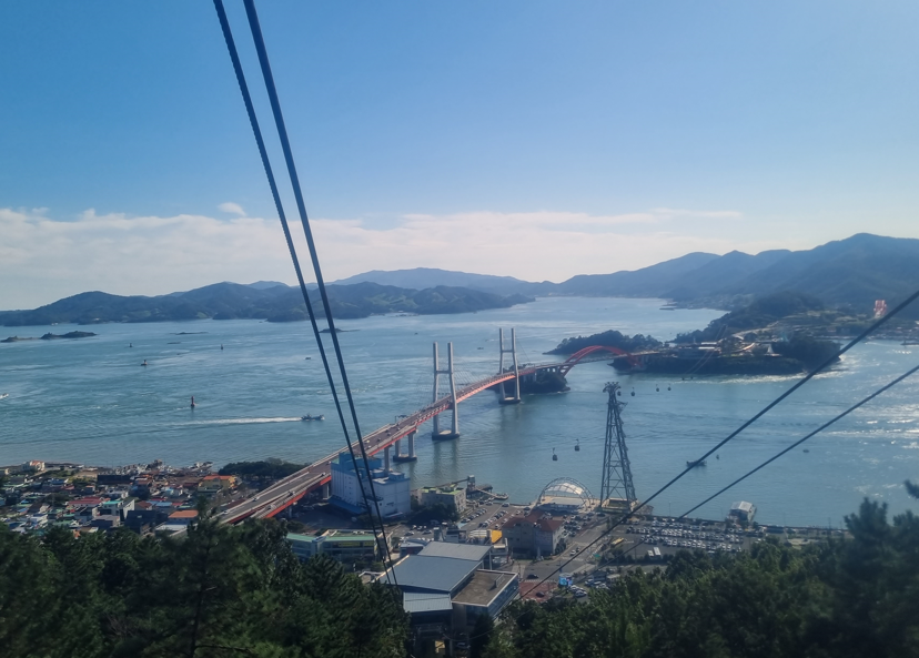 케이블카가 출발하고 점점 높이 올라갈수록 바람이 불어오는 소리와 함께 사천의 풍경이 시원하게 펼쳐졌습니다. 케이블카 안에서 바라본 한려해상 국립공원의 절경은 정말 멋있었습니다. 초양정류장에 도착하니 푸른 바다와 초양섬의 자연이 어우러져 아름다운 풍경을 만들어 냈습니다.