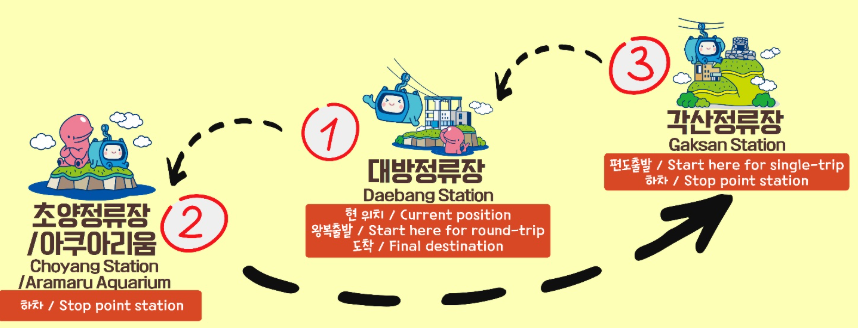 케이블카는 왕복으로 이용했기 때문에 다시 대방정류장으로 돌아왔습니다. 돌아오는 길에는 초양정류장에서 봤던 풍경을 다시 한 번 반대 방향에서 감상할 수 있어 색다른 느낌이었습니다.