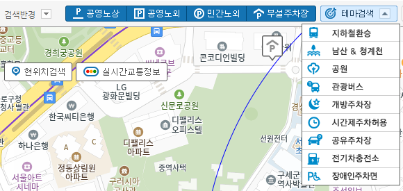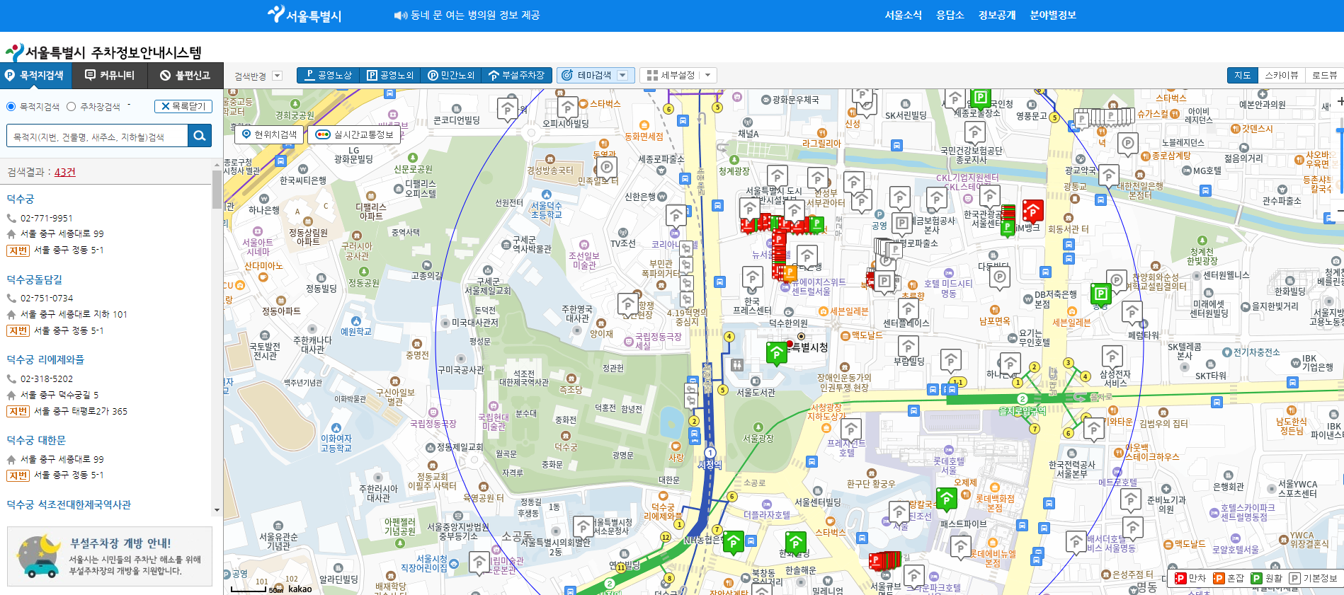 서울특별시 주차정보시스템은 서울시내의 주차장 정보를 실시간으로 제공하는 편리한 서비스입니다. 무료주차장은 물론 유로주차장, 공영주차장 등 다양한 정보를 손쉽게 확인할 수 있습니다. 공영, 민영 주차장 4,641개소 510,539면에 대한 주차장 위치, 요금, 운영시간, 할인정보 등 기본정보를 제공하고 있습니다.