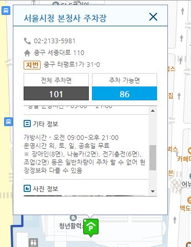 목적지를 서울시청으로 하고, 테마검색에서 휴일무료개방 주차장을 검색한 결과 서울시청 본청사 주차장에 대한 정보가 나타났습니다. 해당 주차장을 클릭하면 전체 주차면수와 실시간 주차가능면수가 표시가 됩니다. 또한 주차 요금 정보와 주차장 개방시간 등을 알 수 있습니다. 스마트폰 주차정보앱으로 검색하면 설치된 티맵과 같은 내비게이션 자동연결 길안내 서비스를 이용할 수 있습니다.