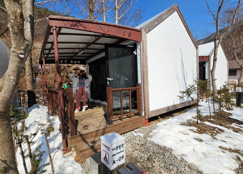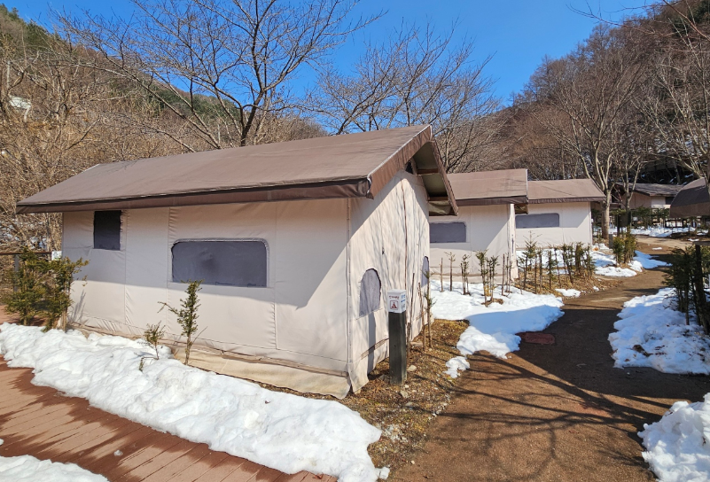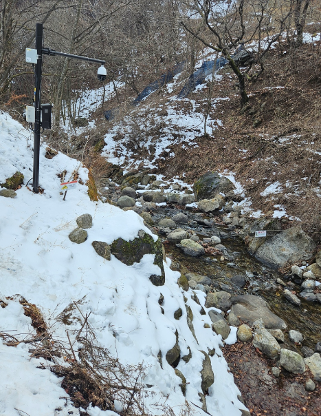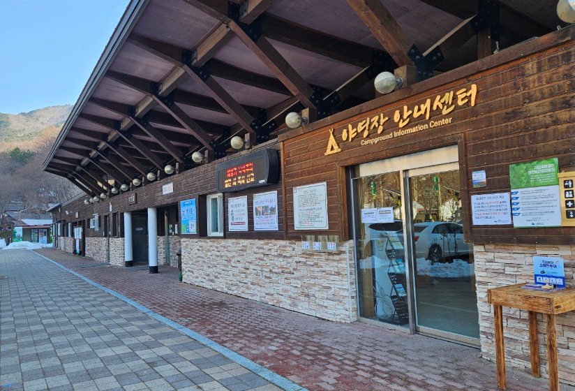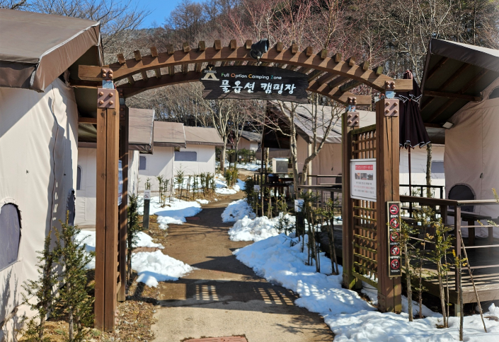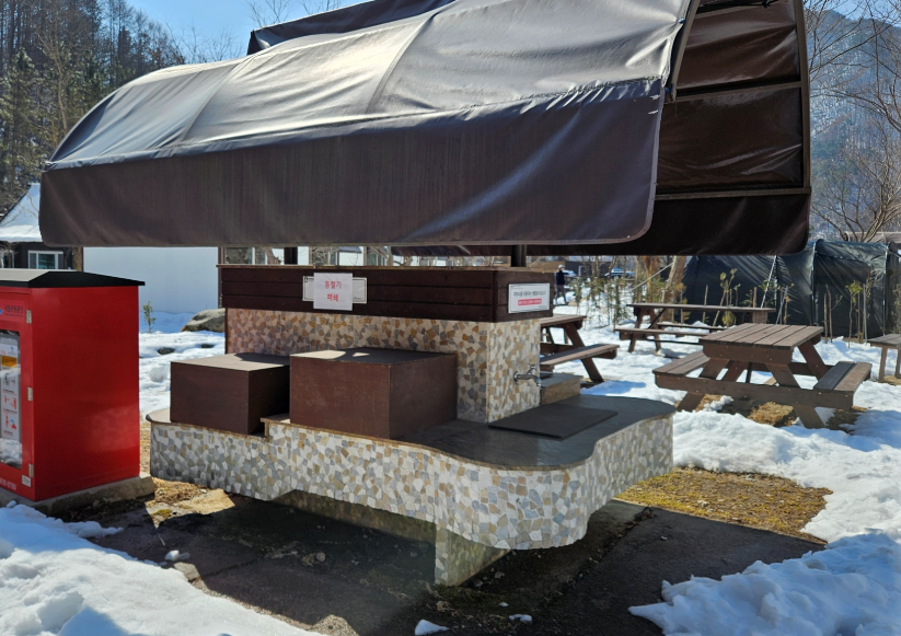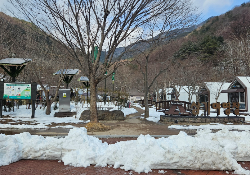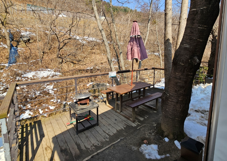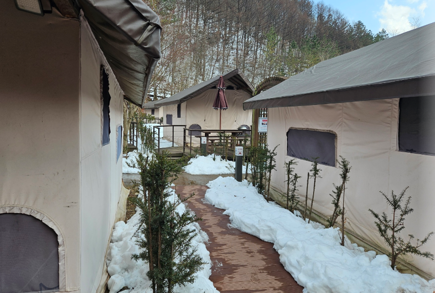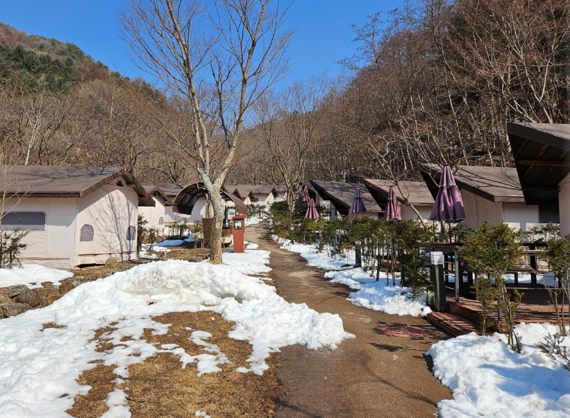 3월인데도 불구하여 야영장 곳곳에 눈으로 가득했어요 도시와 분위기가 완전 달랐어요 야영장 바로 옆에 계곡도 있어서 여름에 놀러 오면 정말 좋을 것 같았지만 아직까지 추워서 계곡에 들어갈 엄두가 나지 않았어요