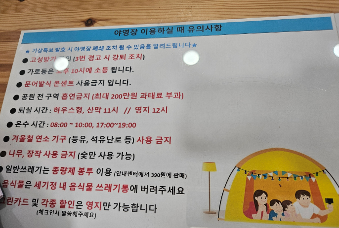 삼가야영장 운영규칙에 등유난로 사용이 금지 되어 있었는데 난로 없이는 겨울철 이용이 거의 불가하다고 생각해야 해요. 다른 블로그 후기 글들을 봐도 원칙적으로 난로사용이 금지되지만 검사를 하지는 않는다고 해요. 저희도 팬히터 안가지고 갔으면 정말 고생했지 싶어요 다행히 팬히터 온도 23도 정도 맞추고 생활하니 딱 좋았답니다.