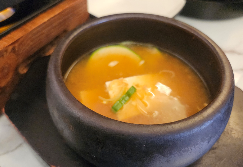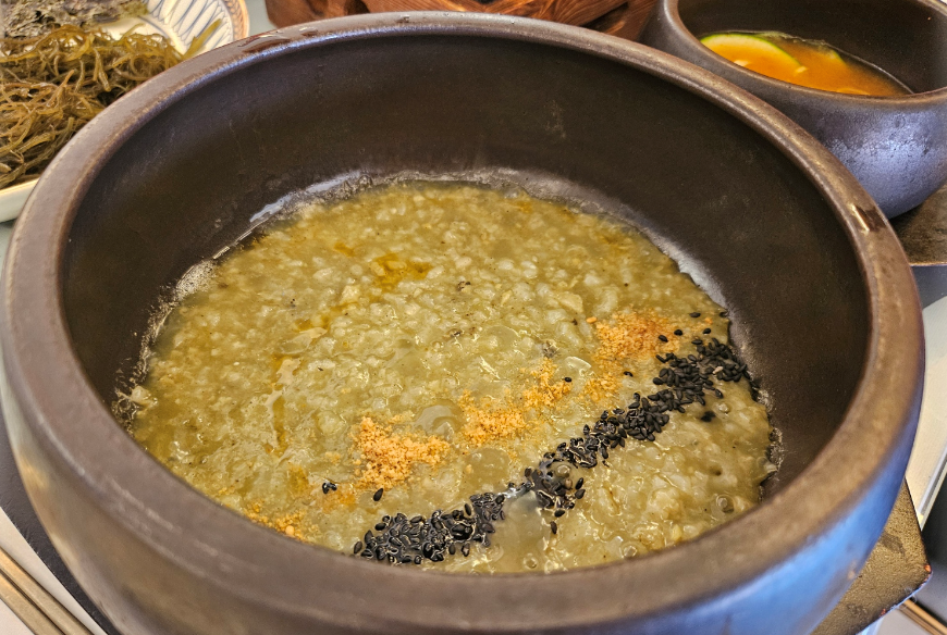 - 봄 세트 구성에서 직화 차돌박이 전골, 돌솥밥 대신 명품 제주 활전복죽과 된장찌개로 바뀐 버전