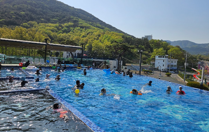 온천 야외수영장은 지하 550M에서 올라오는 천연 온천수를 사용하여 따뜻하게 사계절 모두 사용 가능하며, 수영장 온수 온도는 32도를 유지하고 있습니다.