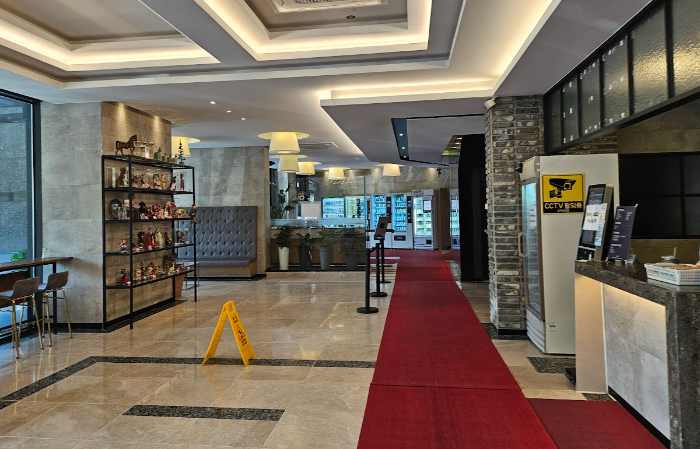 로비 바닥에 붉은 천과 안전 유의 표지판이 설치되어 있는 것을 보니