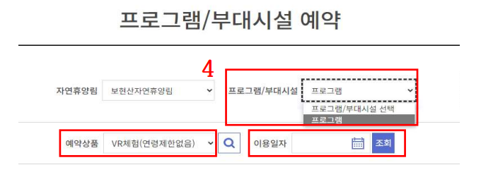 프로그램 / 부대시설에서 산림레포츠체험을 선택하고 이용일자를 선택합니다.
