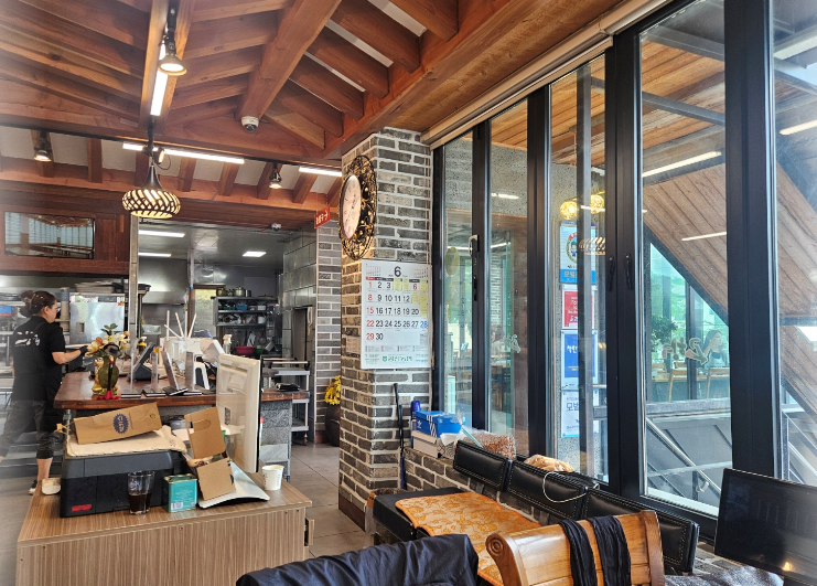 식당은 현대식 건물에 깔끔한 분위기입니다. 카페 같은 큰 창문으로 들어오는 햇살이 정말 좋았어요
