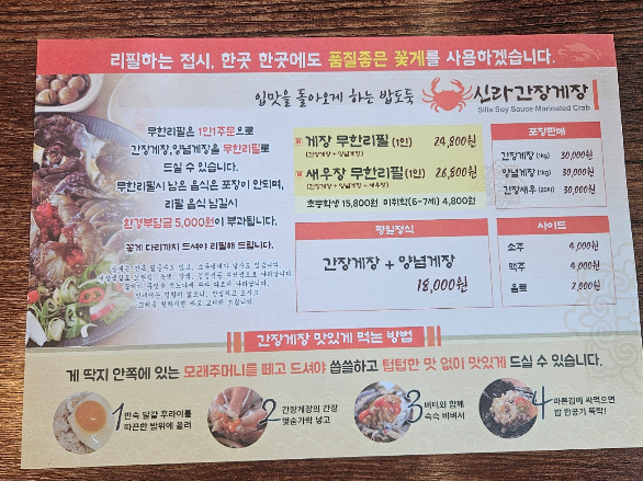 - 무한리필 메뉴: 게장과 새우장을 무한리필로 즐기려면 새우장 포함 무한리필(약 26,800원)을 주문하면 됩니다.
