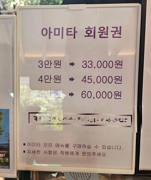 주문하고 계산할때 아미타 회원권을 구입하시면 10%정도 할인을 바로 받을 수 있습니다. 계좌이체를 통해서 아미타 회원권으로 더욱 저렴하게 메뉴를 즐겨 보세요