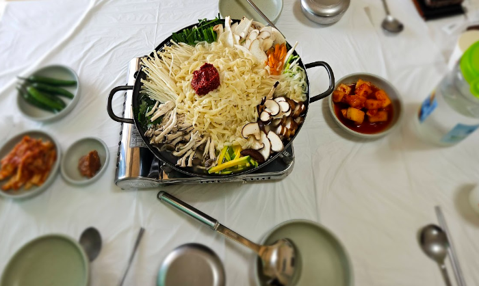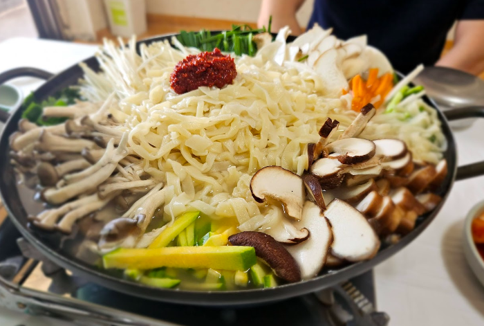 저희는 현지 지인의 인생맛집이라는 추천메뉴인 칼국수 버섯전골 3인분과 파전을 주문했습니다.