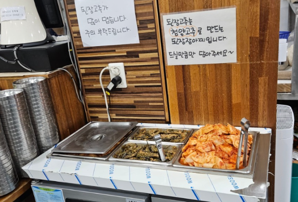 물과 반찬은 셀프입니다. 셀프바에는 된장고추와 무김치가 전부입니다.